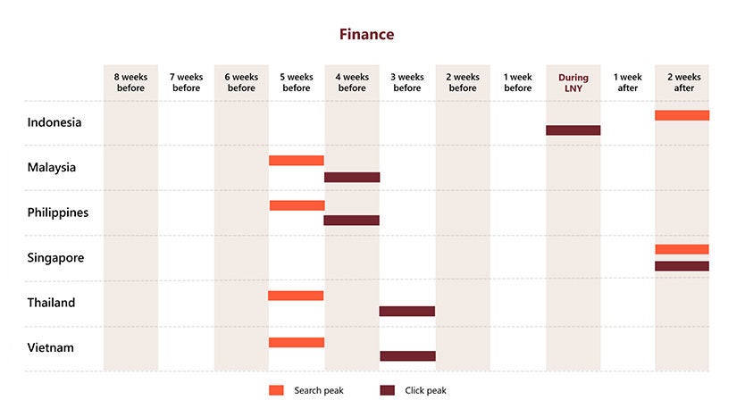 Finance search and click peaks around Lunar New Year in Southeast Asian countries.