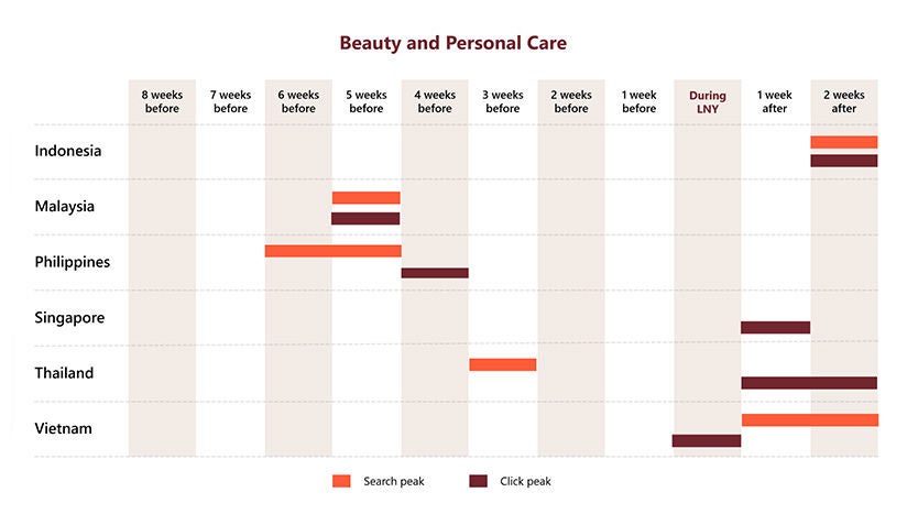 Search and click peaks for Beauty and Personal Care products around Lunar New Year in Southeast Asian countries.