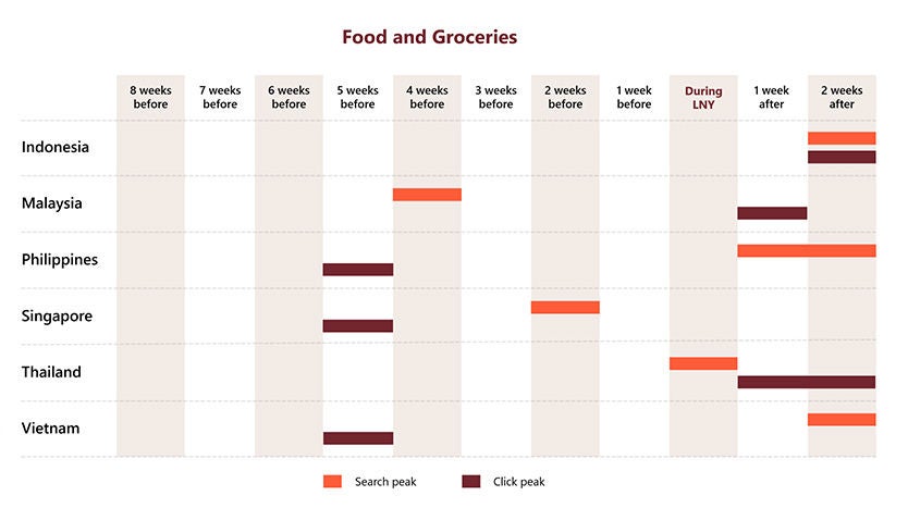 Food and Groceries search and click peaks around Lunar New Year in Southeast Asian countries.