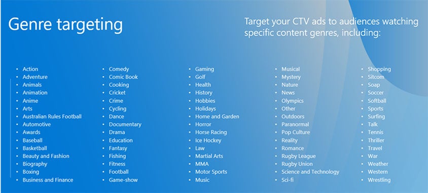 Genre targeting for CTV also allows you to target your CTV ads to audiences that are watching specific content genres. With over 70+ genre options to choose from, you can algin your brand perfectly with shows and movie genres that resonate with your target customers.