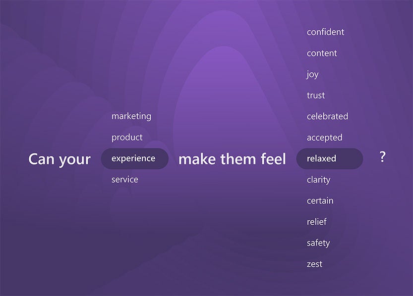 The image poses a motivational question to businesses and marketers, asking if their marketing, product, service, or experience can make customers feel confident, content, joy, trust, celebrated, accepted, relaxed, clarity, certain, relief, safety, or zest.