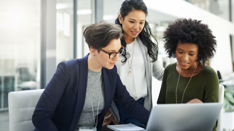 A woman wearing a yellow sweater sits at an office in front of  laptop and smiles while talking to someone else.