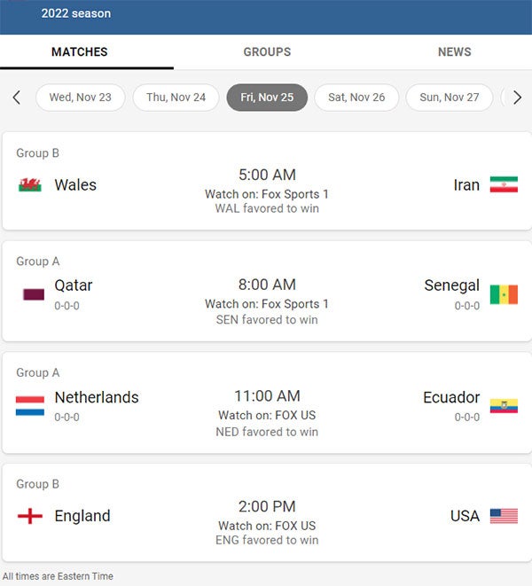 Microsoft Bing sports schedule widget: Match times (Eastern Time) on Black Friday.