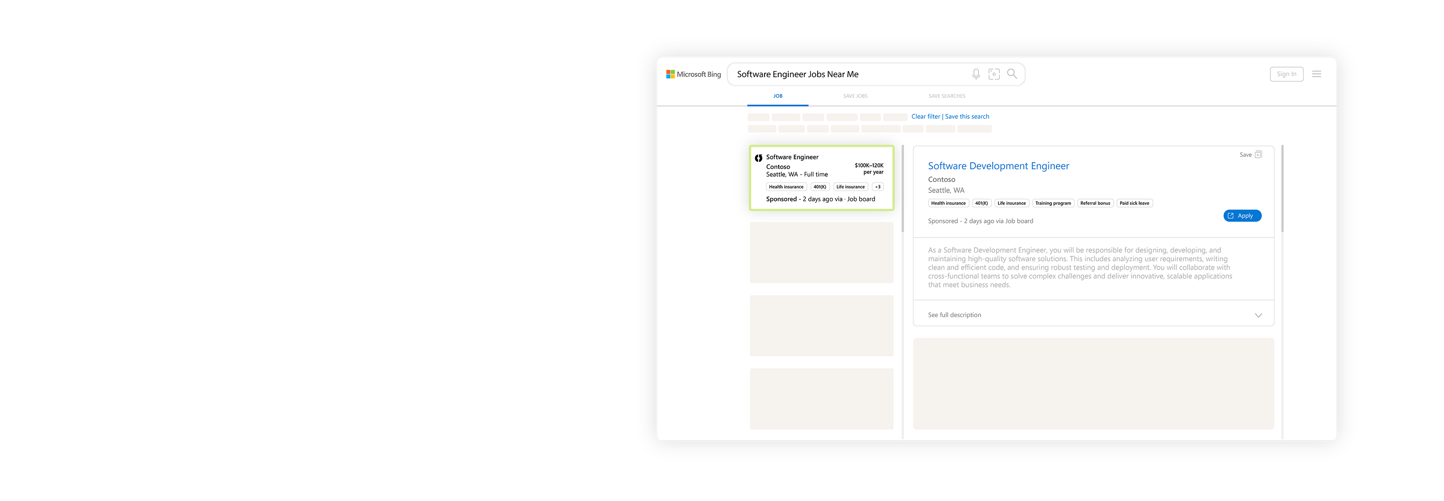 Advertise your job offers to the right job seekers on the Bing Jobs page. You only pay for the second click—when your customer applies for the job—you don’t pay when they click to view the ad.