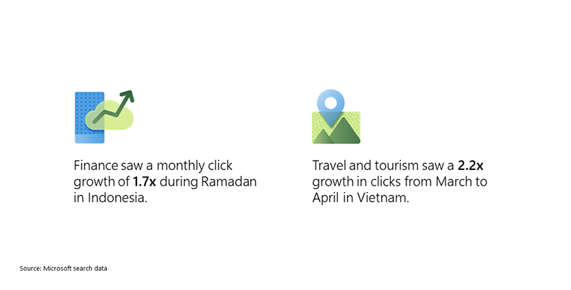 1. Les trois principaux secteurs verticaux : le voyage et le tourisme ont connu une montée en puissance du « search and click » avant l'Aïd, les gens attendant avec impatience leurs retrouvailles. La finance a enregistré une croissance à trois chiffres avant et pendant le Ramadan.