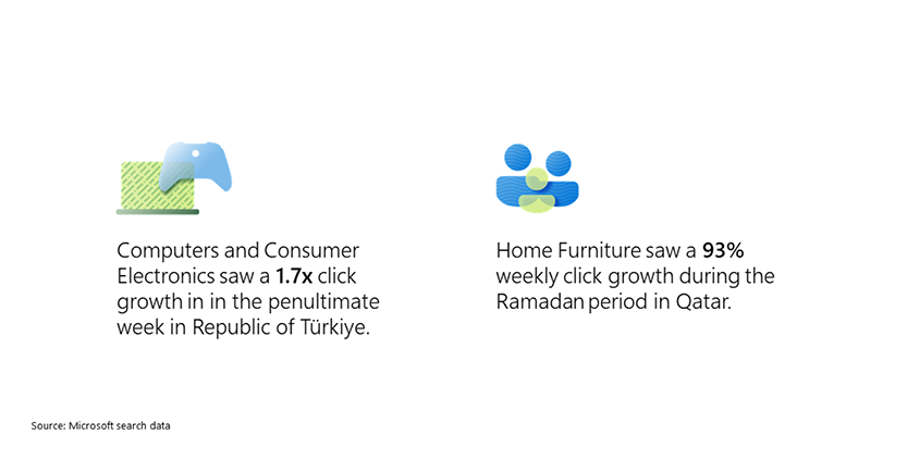 Concernant les trois principaux secteurs verticaux : les opérations de « search and click » ont culminé avant l'Aïd dans les catégories Ordinateurs et Électronique grand public . La République de Turquie a dépassé tout le monde avec une incroyable croissance à trois chiffres de +174 % au cours de l'avant-dernière semaine.