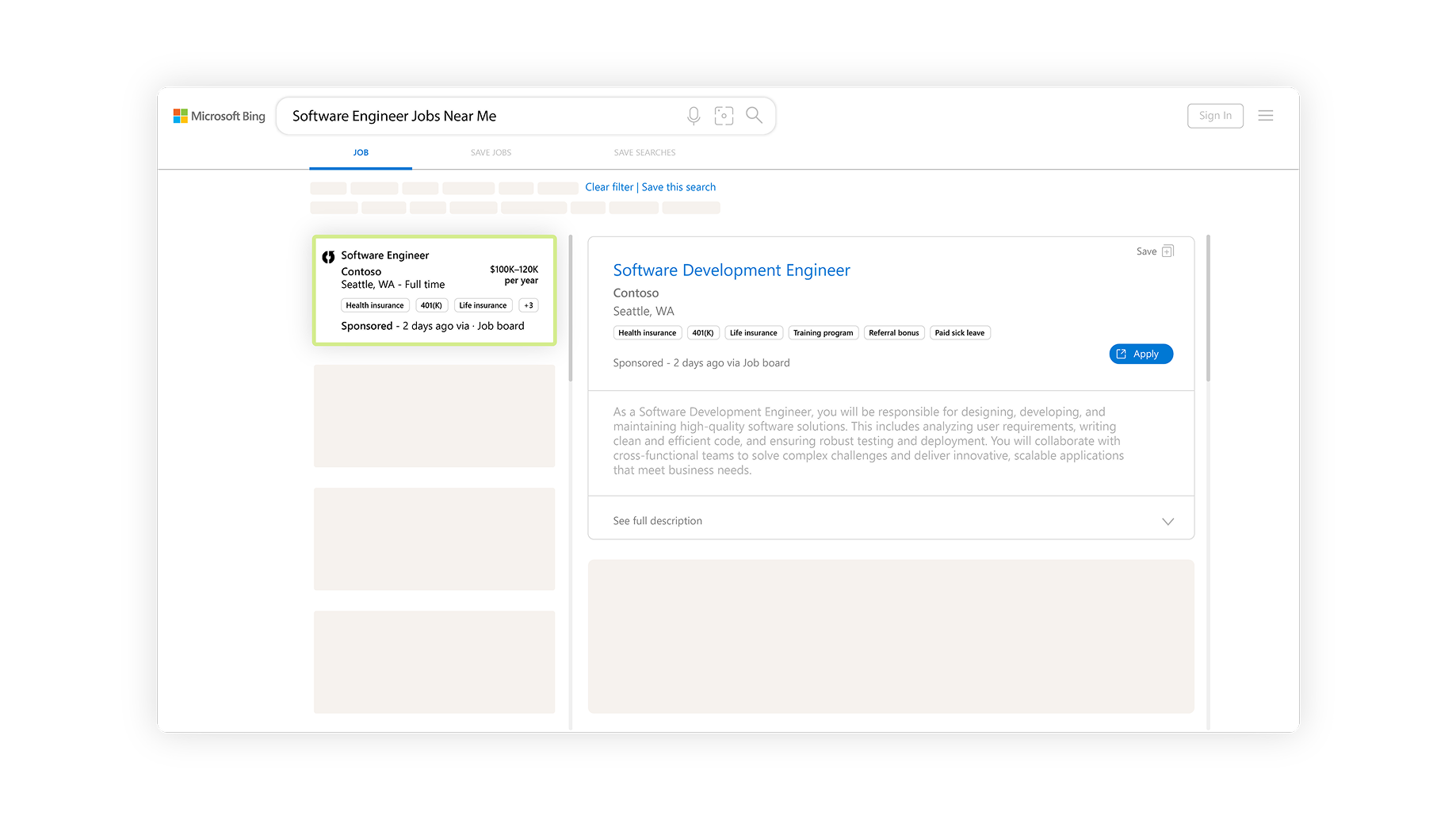 Bing 求人ページで適切な求職者に求人を宣伝できます。2 回目のクリック (顧客が求人に応募した場合) に対してのみ料金が発生します。顧客がクリックして広告を表示したときに料金が発生することはありません。